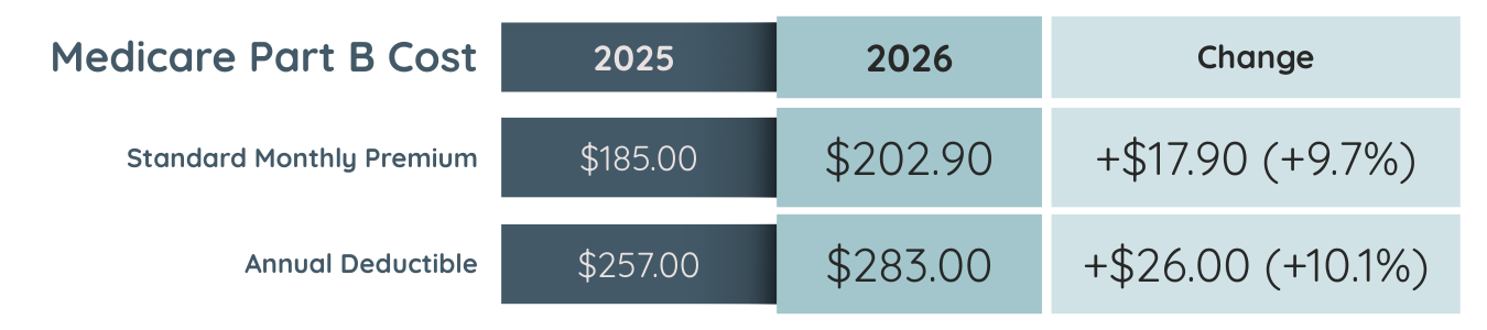 • Standard Medicare Part B premiums increased by nearly 10% from 2025 to 2026.