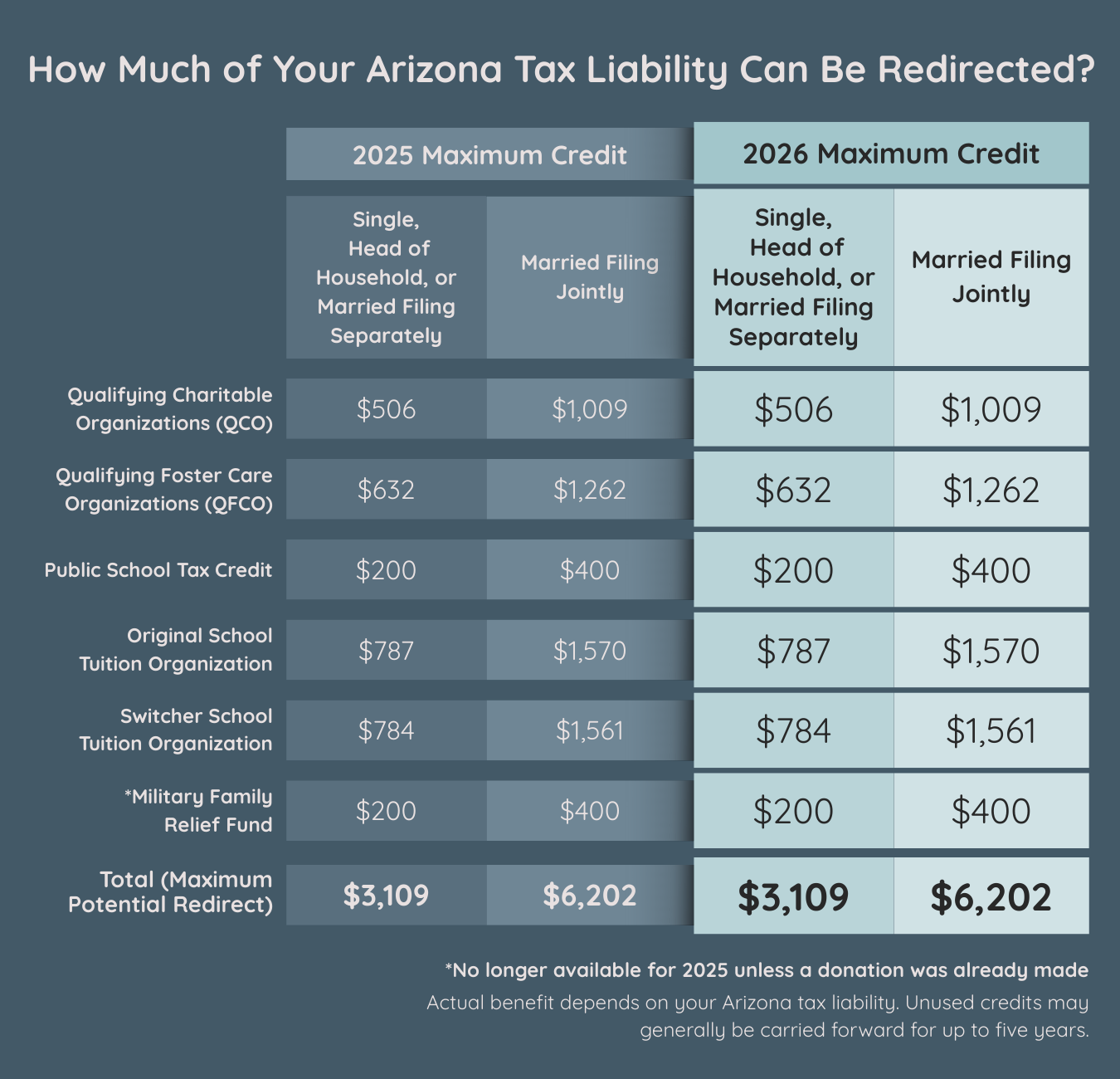 For 2025 and 2026, Arizona taxpayers may be able to redirect up to the following amounts of their Arizona state tax liability to qualifying causes: